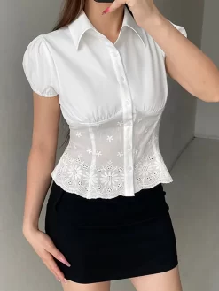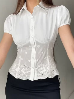 Women’s Summer Slim Fit Shirt Flower Jacquard Eyelet Short Puff Sleeve Lapel Button Down Tops Streetwear