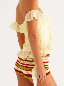 Women Off Shoulder Tops Solid Color Ruffle Trim Short Sleeve Shirts Summer Y2K Blouses Summer Streetwear