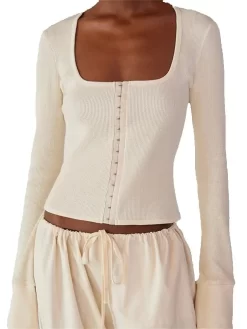Women Long Sleeve Shirts Solid Color Knit Square Neck Buckle Slim Fit Tops Spring Fall Vinatge Casual Blouse Streetwear